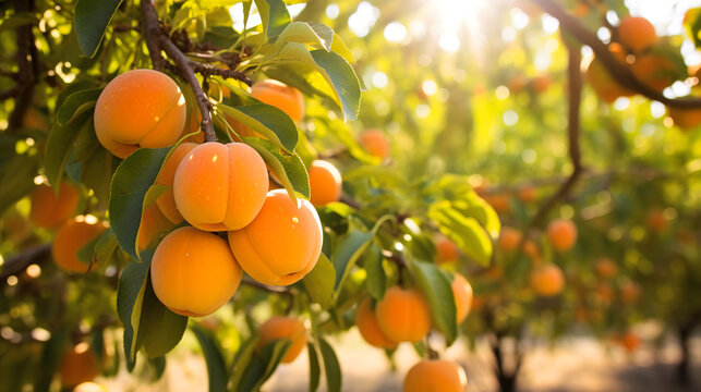 A bunch of ripe apricots branch in sunlight