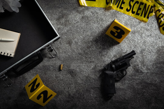 Evidences and crime scene markers on grey stone background, flat lay