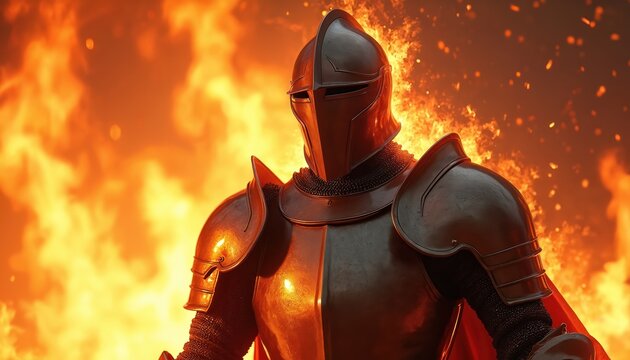 Armored knight stands amid blazing inferno. Metal clad warrior heroically faces intense heat. Illustration for epic battles, bravery tales, gaming themes, fantasy worlds exploration, power display.