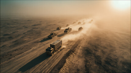 Military convoy of trucks and armored vehicles traversing a dusty desert landscape during sunrise.