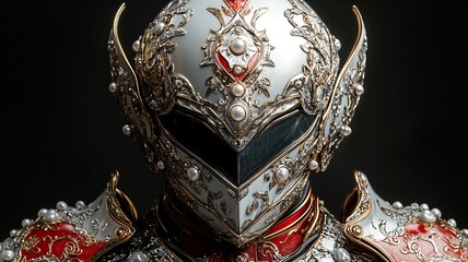 Elaborado casco de armadura con detalles intrincados y perlas, sobre un fondo negro.