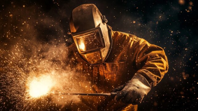 Industrial welder in safety gear, including mask, gloves, and jacket, working amid sparks