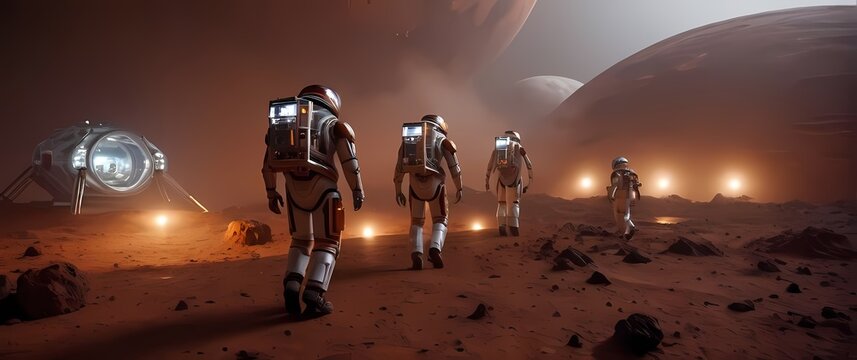 Mars colonization scene with robots working alongside astronauts to build habitats