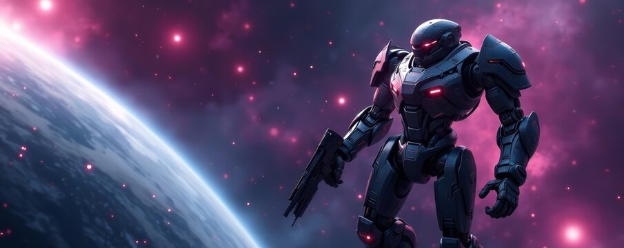 A futuristic, armored figure with glowing red eyes, holding a rifle