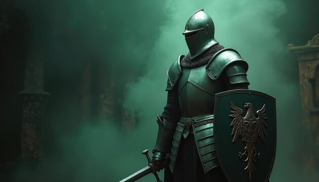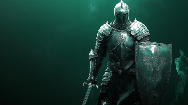 Medieval knight in shining armour with a shield and sword. Warrior in steel armor against a mysterious fogged background. Historical reenactment, fantasy battle scenes. Concept art.