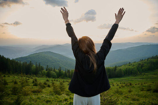 A woman stands on a mountain ridge with arms raised high, celebrating the beauty of nature as the sun sets in the background. Surrounding hills are covered in rich greenery, creating serene atmosphere