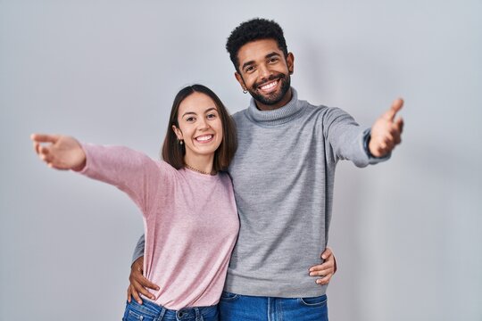 Young hispanic couple standing together looking at the camera smiling with open arms for hug. cheerful expression embracing happiness.