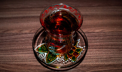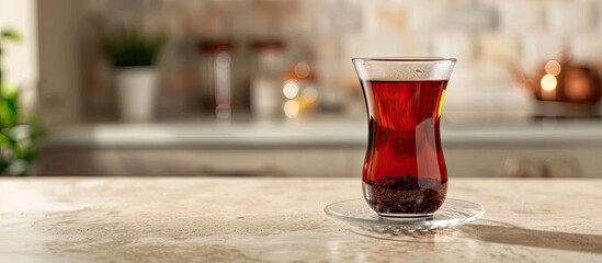 Glass with hot Turkish tea on table in kitchen. with copy space image. Place for adding text or design