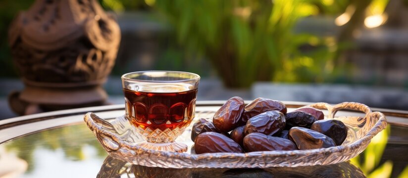 Dry dates in a bowl with tea served in an armudu glass outdoors surrounded by lush greenery and natural sunlight