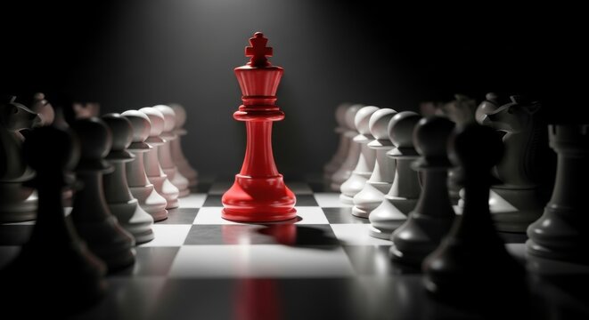 Red chess king piece illuminated on a chessboard, facing an opposing army of white pieces, symbolizing leadership and challenge.
