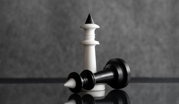 A lone white king chess piece stands against a dark army on a chessboard, symbolizing strategy, leadership, and facing competition