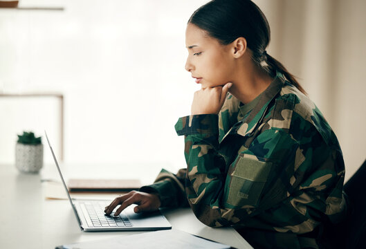 Military, war and woman with a laptop, thinking and connection with network, website information and surveillance. Soldier, employee and veteran with a pc, communication and problem solving research
