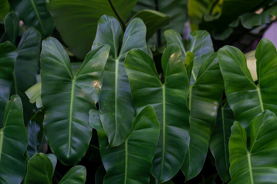 close up of Philodendron gloriosum leaves, dark leaves indoor plants, tropical garden, heart leave philodendron