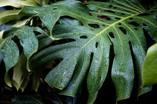 Lush foliage background. Green plant wall design of tropical leaves (anthurium, philodendron pastazanum, epiphytes or ferns). Dark green plants growing in cloud forest, rainforest in tropical climate