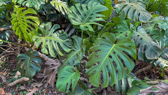 Overhead view of a dense covering of large, green, split leaves of Monstera deliciosa (Swiss Cheese Plant). Sunlight highlights the fenestrations and glossy texture against the dark garden floor.