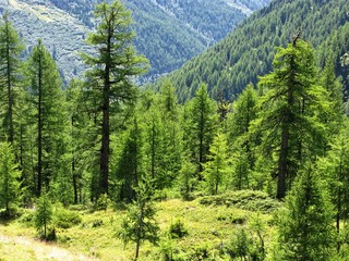 Arolla pine trees catching the light near the village of Arolla, Switzerland