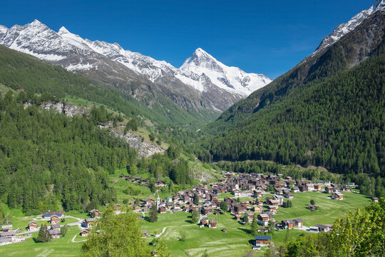 Blue lake - Lac Bleu - and amazing mountains near Arolla in Valais Canton, Switzerland