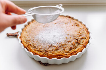 Hot cup of tea on a table with checkered cloth and plant in the background
