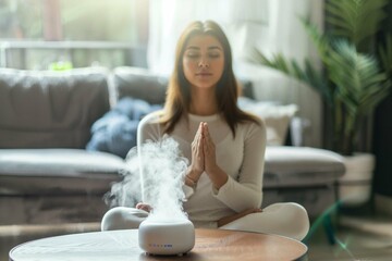 Peaceful woman meditating with aromatherapy from an essential oil diffuser at home
