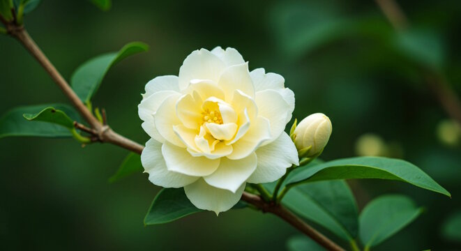 closeup beautiful white Indian jasmine or jasminum sambac flower on plant, in India known as mogra, jui, chameli, malti, mallika, jai in soft blur background