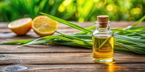 Aromatic Citronella Essential Oil on Wooden Table, aromatic essential oil, citrus