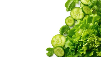 Green lettuce and cucumber on white background arranged as a layout background for food photography, World Food Day