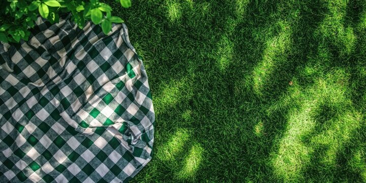 Checkered picnic blanket on a green grass background. Top view. Copy space. Summer picnic season.