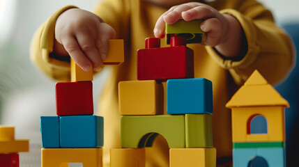A child creating a fantasy town diorama with colorful building blocks. Close-up of small hands arranging structures.