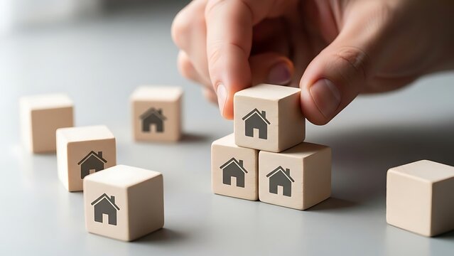 Concept of Building Financial Success: A miniature figurine of a person and a hand arranging wooden blocks to create a rising structure, with stacks of coins next to the build structure
