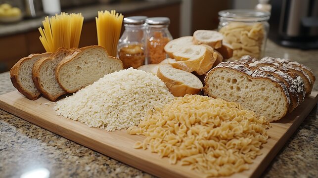 Selection of high carb foods including bread pasta and rice arranged on a sleek countertop emphasizing diverse energy packed meal components
