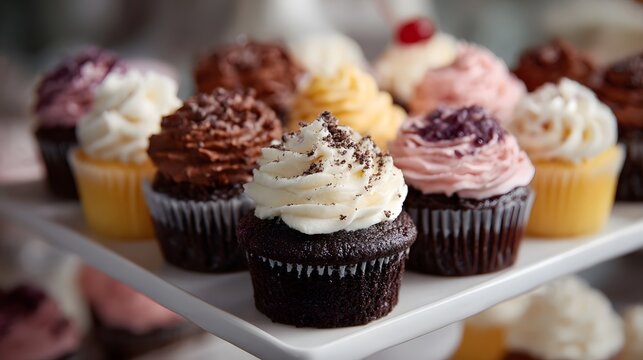 A colorful assortment of handcrafted cupcakes topped with swirls of buttercream frosting and sprinkles, arranged on a vintage cake stand, Cupcake display centered