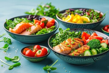 A colorful arrangement of plated dishes from various cuisines, emphasizing vibrant textures on a clean white background