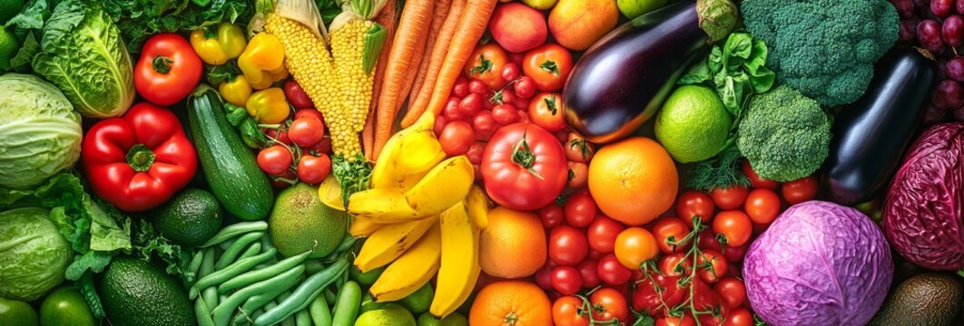 Vibrant rainbow of fresh healthy fruits and vegetables arranged artfully