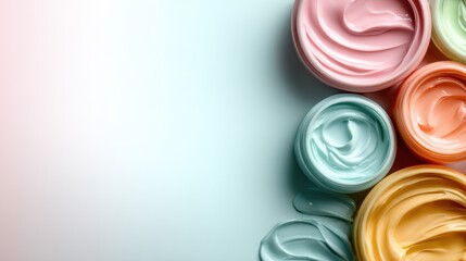 An artistic arrangement of colorful skincare creams in jars highlights the vibrant textures and soft colors, beautifully showcasing a skincare collection for beauty enthusiasts.