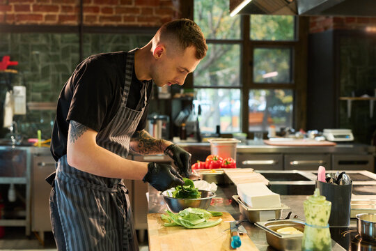 Chef arranging edible flower salad with cherry tomatoes and mixed greens on rustic table