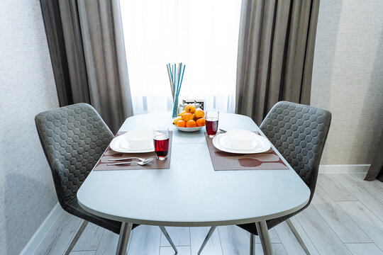 In the dining room, there is a beautifully set table accompanied by two stylish chairs, with plates neatly arranged on the surface, creating a welcoming atmosphere for meals