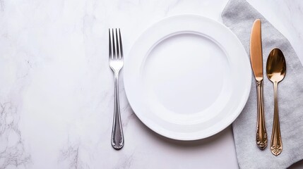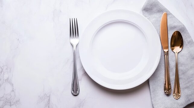 Closeup view of stylish white plate and golden-accented cutlery arranged on a white marble table, ideal for sophisticated dining experiences