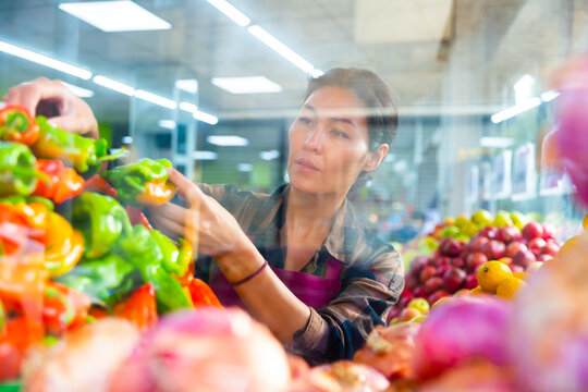 Portrait of focused asian saleswoman working behind glass showcase of greengrocery, arranging fruits and vegetables on shelves