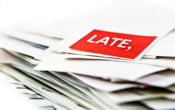 Pile of overdue bills with red late payment stamp representing financial debt and missed payment deadlines isolated on transparent background PNG