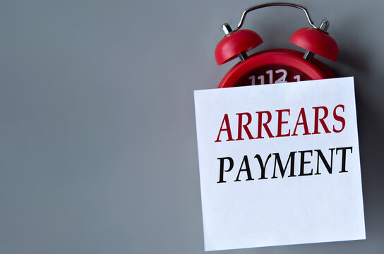 ARREARS PAYMENT - words on a white piece of paper on a gray background. Red alarm clock with white piece of paper