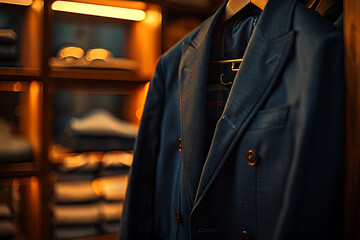 luxury menswear photography, close-up shot of navy-blue suit pants on a valet stand in a walk-in closet golden light and a sleek, cinematic look shot with arri alexa mini lf
