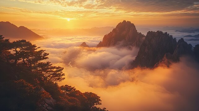 landscape photograph, captured on imax, arri alexa, the sunrise of Huangshan Mountain, a river flowing
