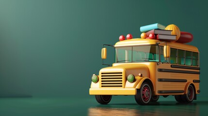 School bus arriving with school accessories and books on blue background. Back to School Concept
