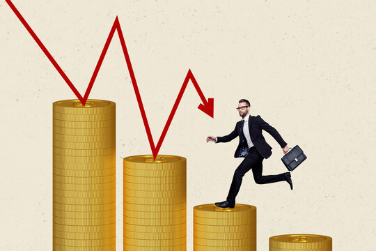 Composite photo collage of serious man run briefcase arrow fall dollar coin stack inflation failure loss isolated on painted background