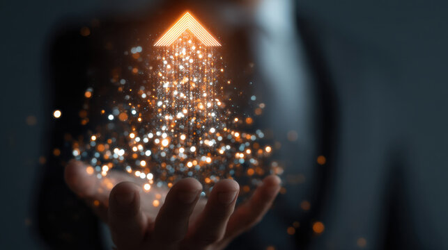 Hand is raised, showcasing glowing arrow made of sparkling particles, symbolizing growth and progress. background is dark, enhancing luminous effect of arrow, creating sense of aspiration