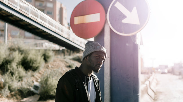 Finger pointing at glowing downward arrow in dark, dramatic silhouette