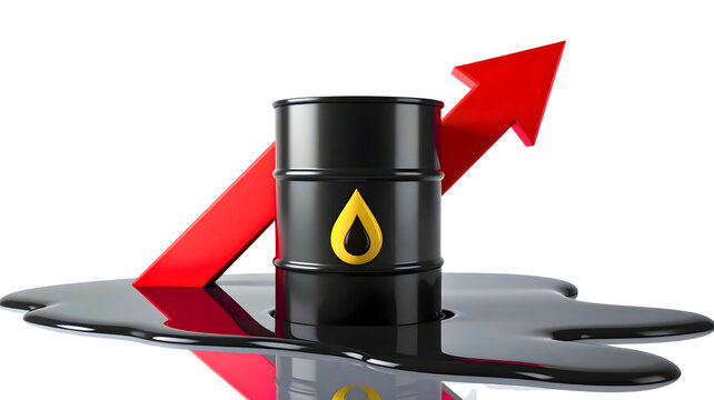 Oil pump silhouette at sunset with rising graph arrow overlayed