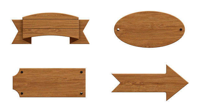 Assorted set of unique wooden signs and directional arrow on an isolated transparent background