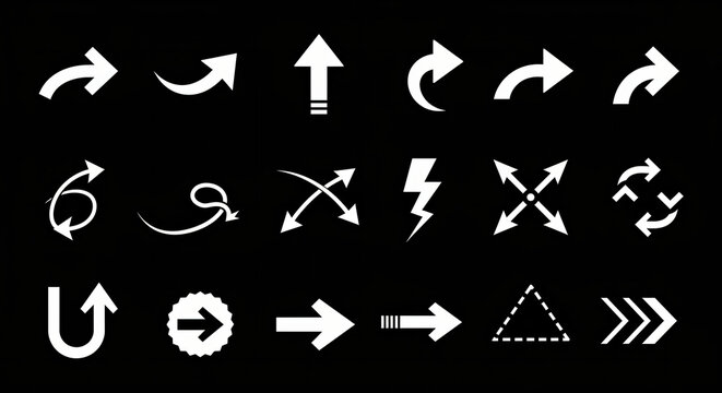 A versatile collection of white arrow icons and symbols, showcasing various styles for navigation, direction, and user interface elements