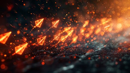 Artistic illustration of glowing orange arrow-like figures in a triangular formation, moving swiftly in a dark space with particles and smoke, creating a sense of speed and motion.